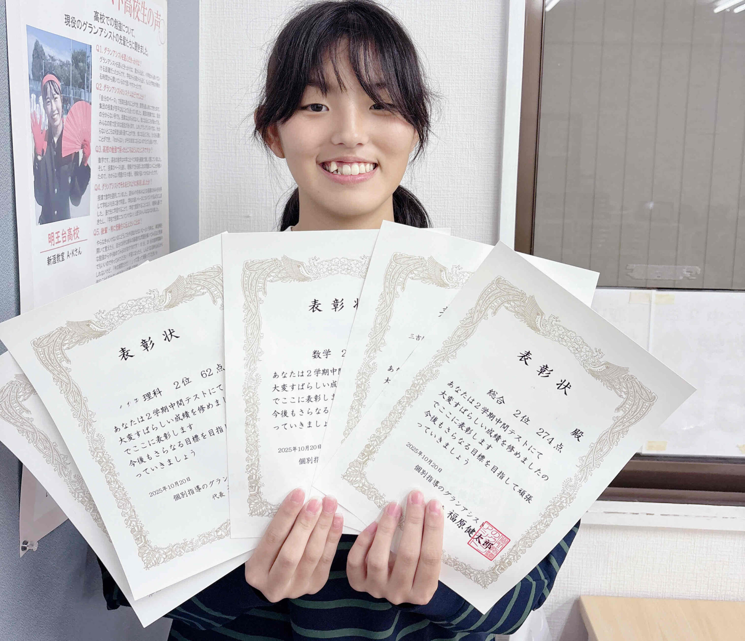 三吉教室のみんなも高得点を目指して頑張ってくれたわけですが、何と今回4教科+総合点数のすべてで上位3位以内に入り、賞状を5枚ゲットしてくれた生徒がいました!!