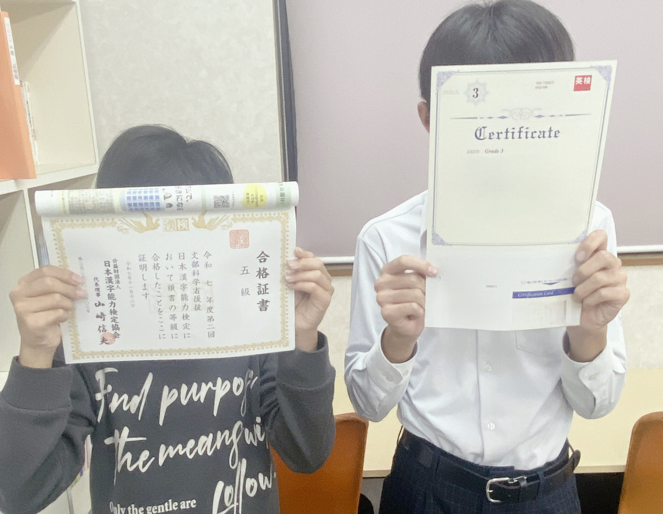 実はグランアシストでは漢検・英検を年3回ずつ実施しているのですが、第2回の実施で新涯教室の生徒さんが漢検5級・英検3級を合格してくれました!