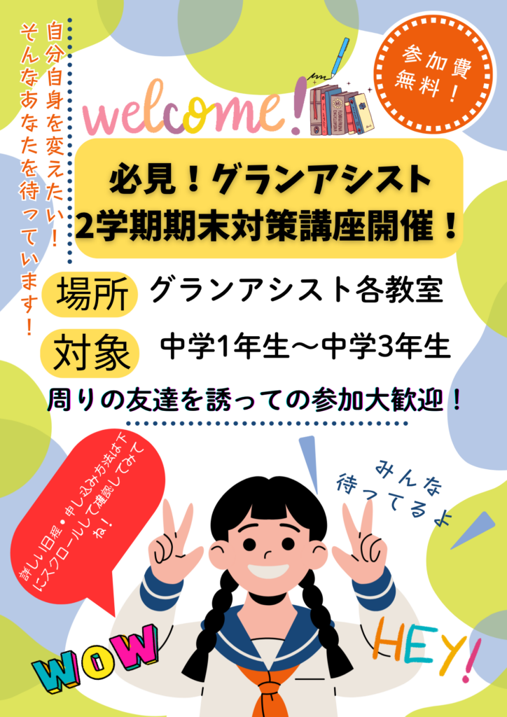 坪生教室:11/12(水) ①16:40~18:50 ②19:00~21:00